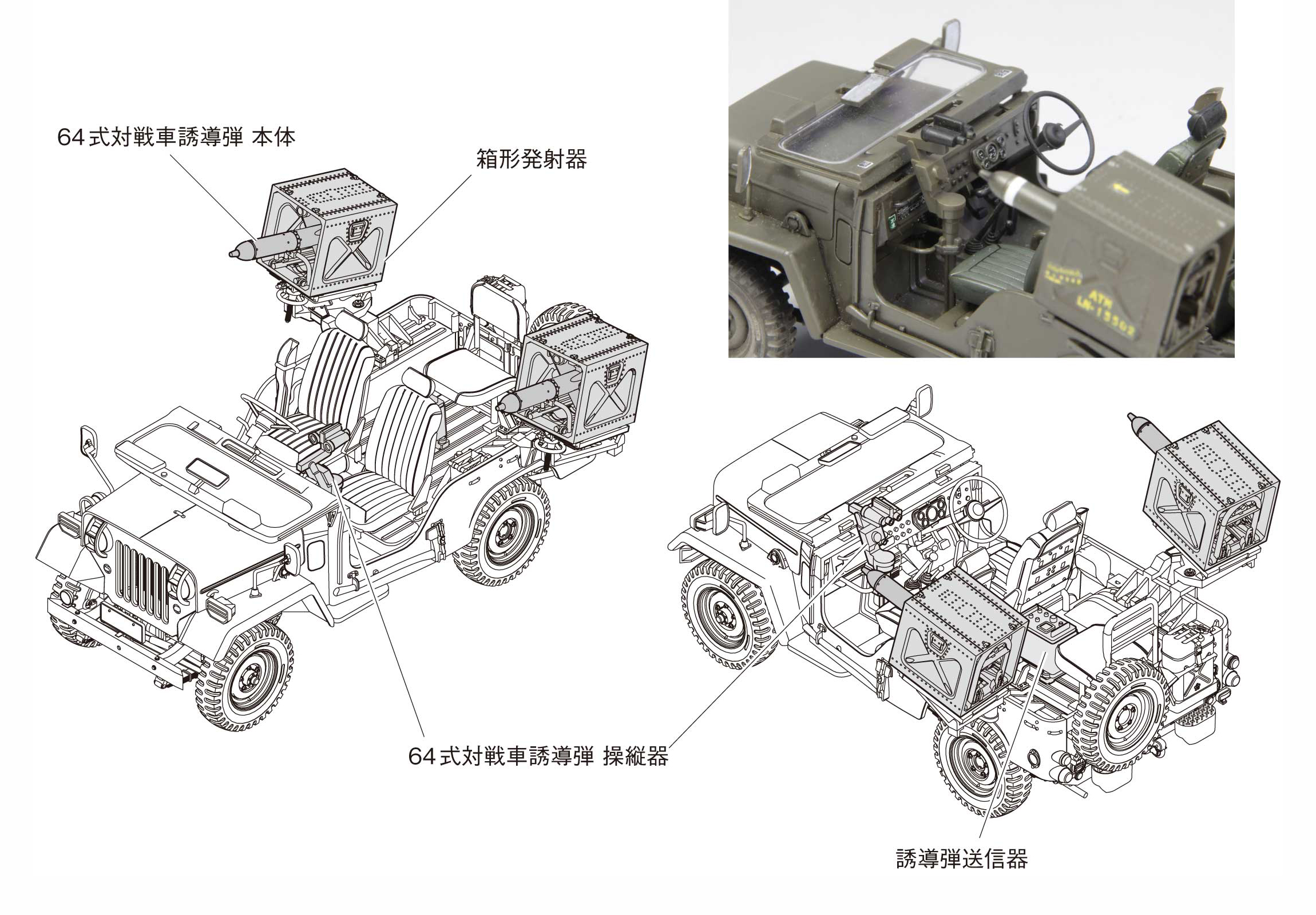 本キットでは、この64MATを専用パーツで再現。73式小型トラック専用の架台、誘導操作用の操縦機、誘導弾本体であるATM-1Bに至るまで、細部にこだわった精密な造形で再現しています。