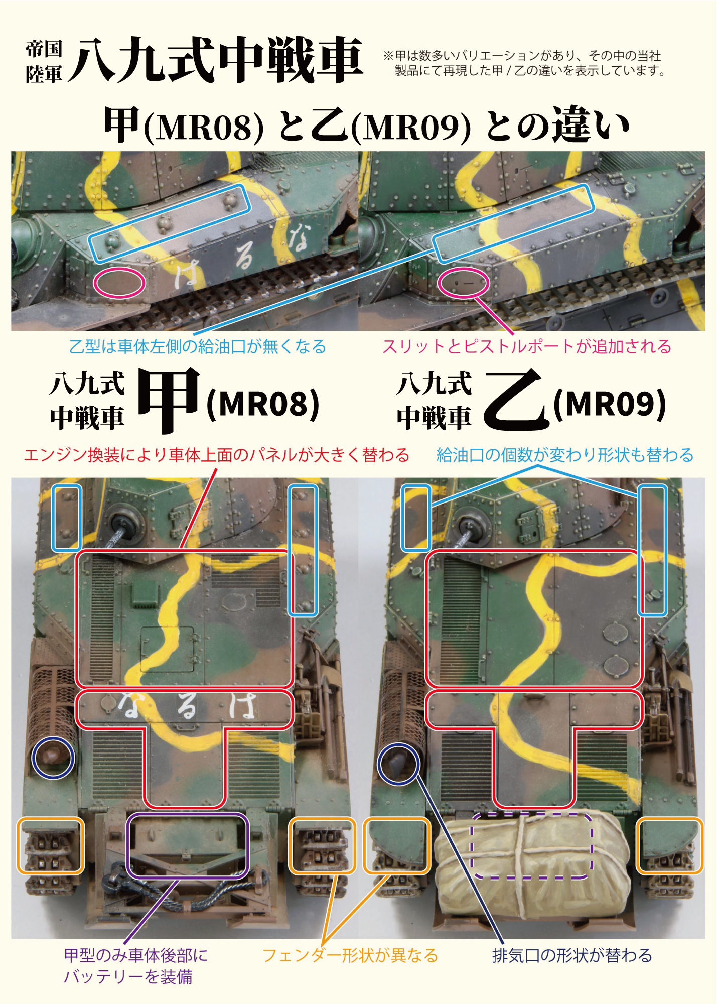 | 日本における最初の制式戦車である八九式戦車は、開発当初にはガソリンエンジンを搭載していましたが、水の確保が難しい大陸での運用を想定し冷却水が不要かつ燃費の向上、さらに燃料漏れなどによる車体炎上の危険性を減らすことも出来る『空冷ディーゼルエンジン』に換装されます。このエンジンに換装されたタイプは乙型と呼ばれ、それまでのガソリンエンジン搭載車両は甲型と呼ばれ区別されました。 |