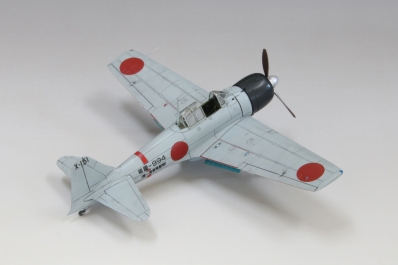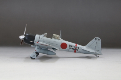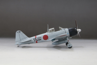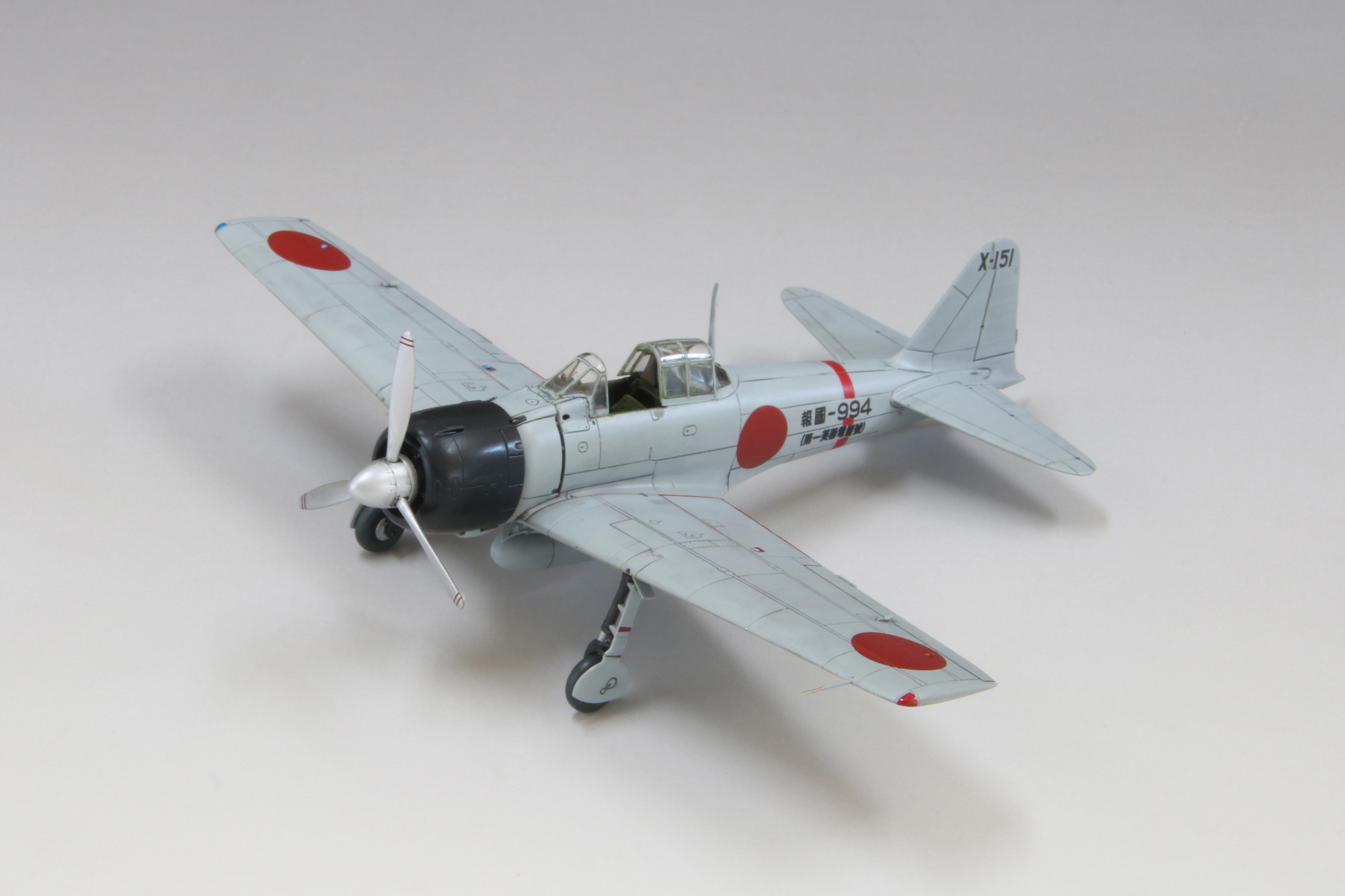 本製品では、胴体・翼・エンジン・プロペラをグレー、カウリング・脚部をブラック、機体内部は黄緑と3色に色分け成形。マーキングはガダルカナル/ニューギニアにて活躍し撃墜破30機を数えるエース『伊藤清』の乗機と、空母瑞鶴飛行隊所属機ほか、『ヒゲの羽切』と呼ばれたエース『羽切松雄』の機体のデカールを封入します。 |