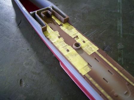 | リノリウムをマスキングした後、艦底色を塗ります。艦底色もマスキングするので、はみ出しは気にせずに塗ってOK。塗装後マスキングします。マスキングはなるべくキッチリと。 |